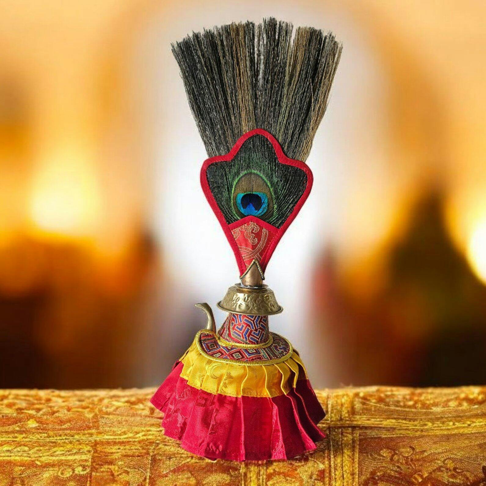 The bumpa top feather, often adorned with peacock feathers, is an important accessory for the bumpa (ritual water vessel) used in Vajrayana rituals. The feathers symbolize the beauty and transcendence of enlightened qualities, enhancing the spiritual energy during offerings or ritual practices. The number of peacock feather eyes will vary, each feather unique in its design, adding a personalized touch to each ritual vessel.