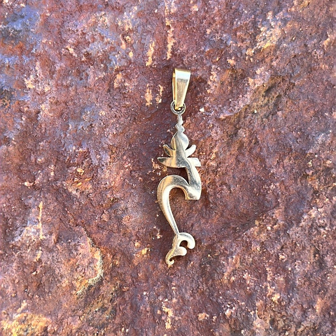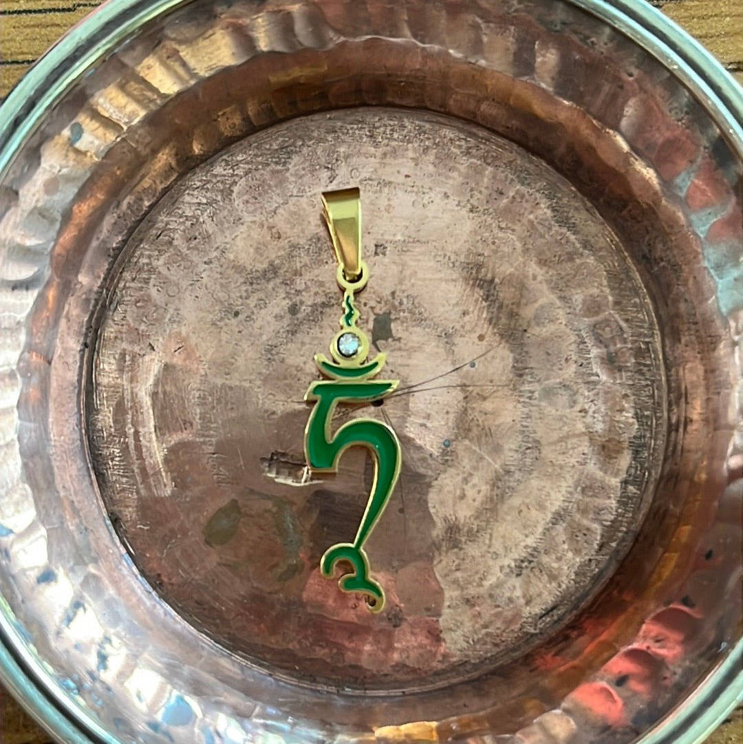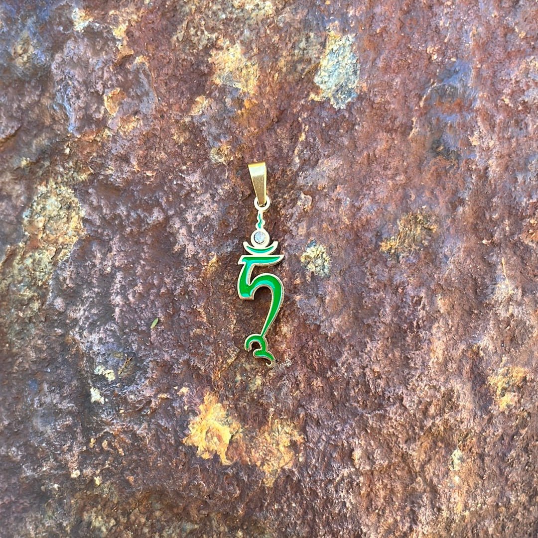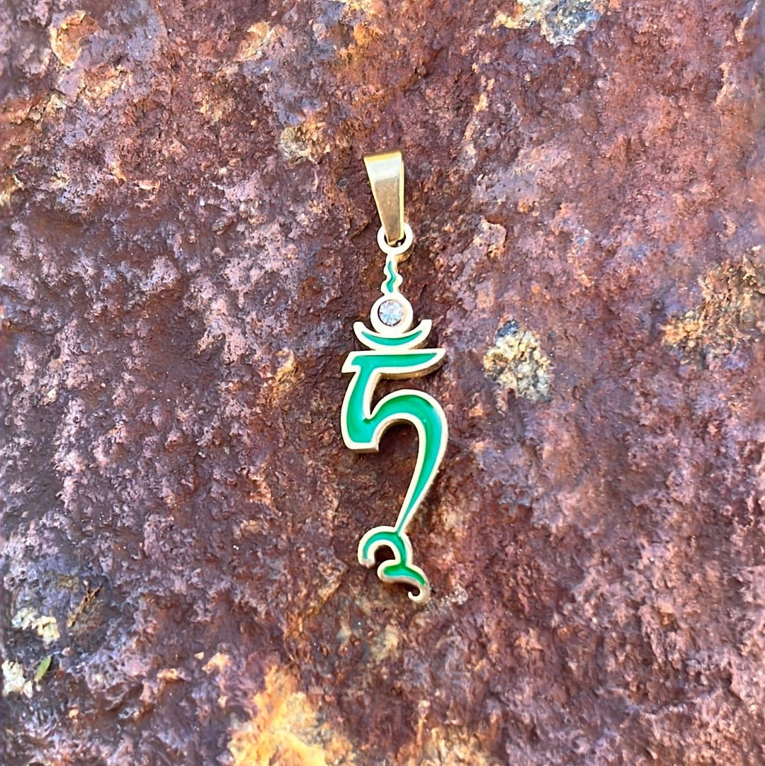 An attractive, elegant and simple TAM-syllable pendant. TAM is the seed-syllable of the buddha Tārā. Tārā is often praised as the embodiment of the compassionate actions of all buddhas. Her name can be translated as both “the liberatress” and also “the star”–an allusion to the pole star which ancient travelers depended on. This pendant includes a clear gemstone on top serving as “the star” that Tārā is!
